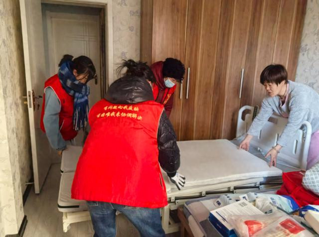 盐庄社区工作人员正在搬运居民刘萍捐赠的护理床。